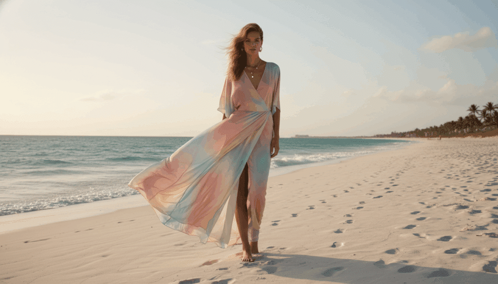 When you’re picking dresses for beach resorts, focus on light materials like cotton and linen. These keep you cool. Look for dresses that don’t cling and let air flow through. Mix different types like maxi and wrap dresses to easily go from the beach to dining out.